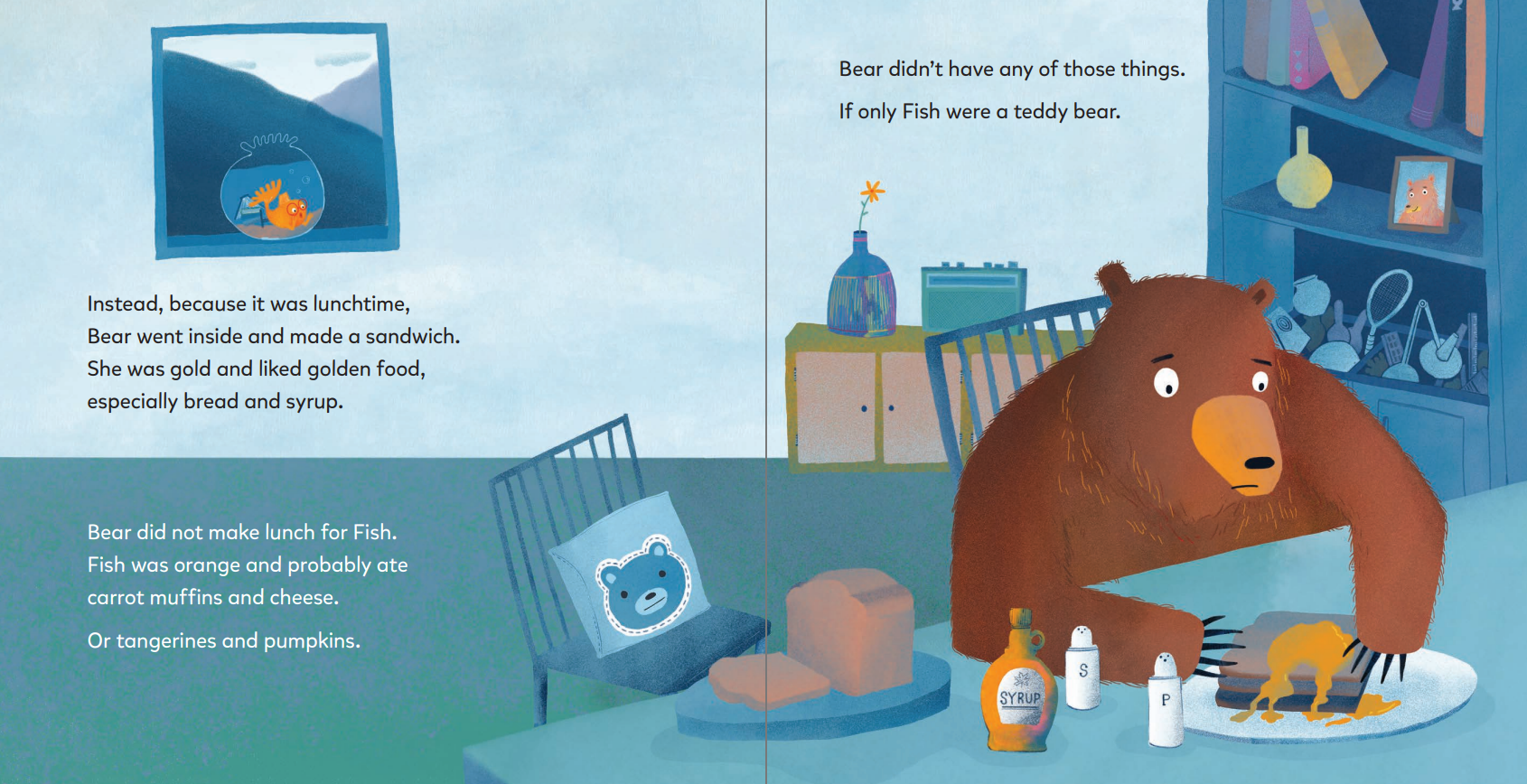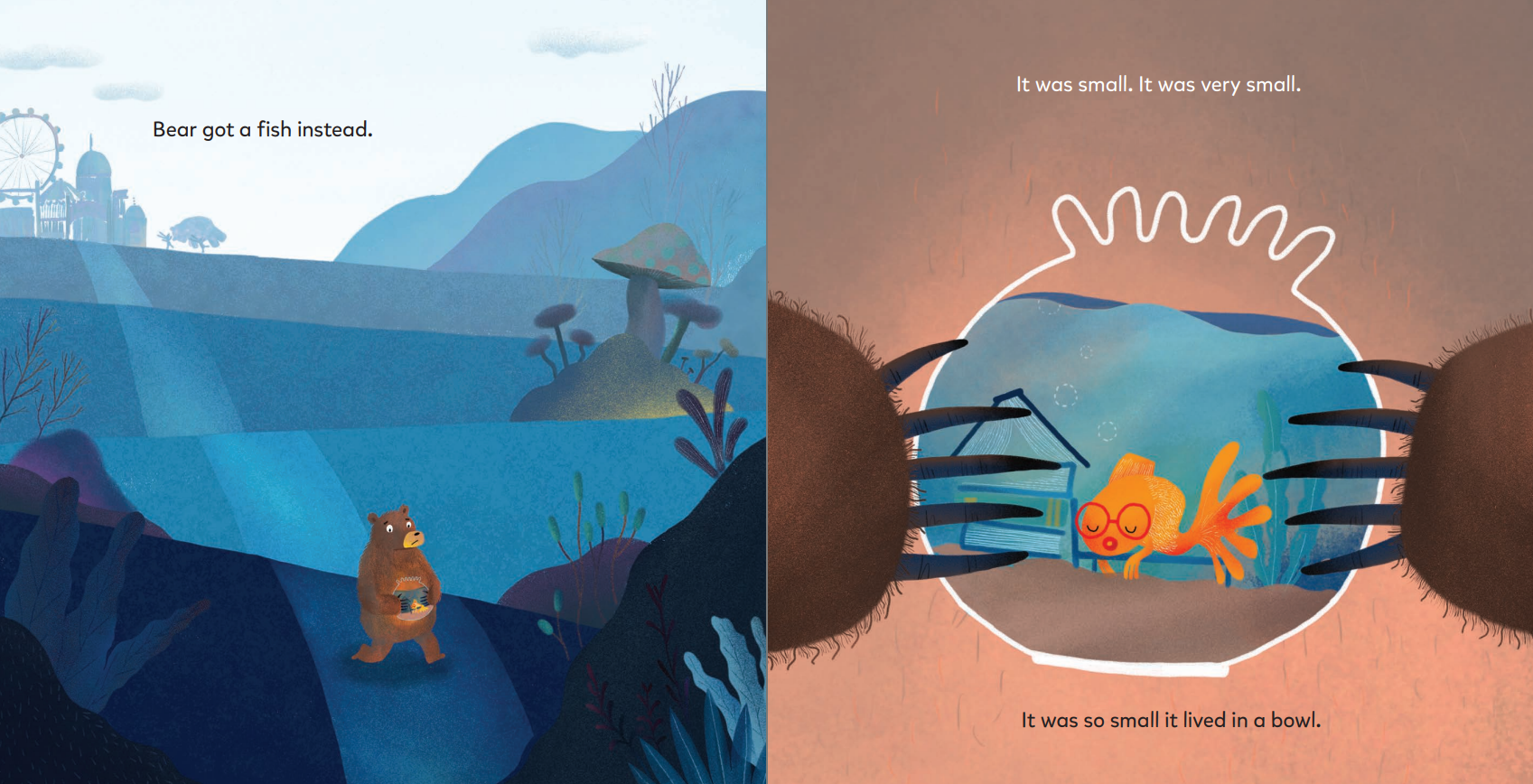 Aber obwohl Fisch klein aussieht, erweist sie sich als größer, als Bärin jemals gedacht hätte. Und Bärin lernt, dass manchmal sogar eine große Bärin in der großen, weiten Welt klein sein kann. Mithilfe von Fisch lernt Bärin, dass sie und Fisch zwar unterschiedlich sind, aber auch ein bisschen gleich.