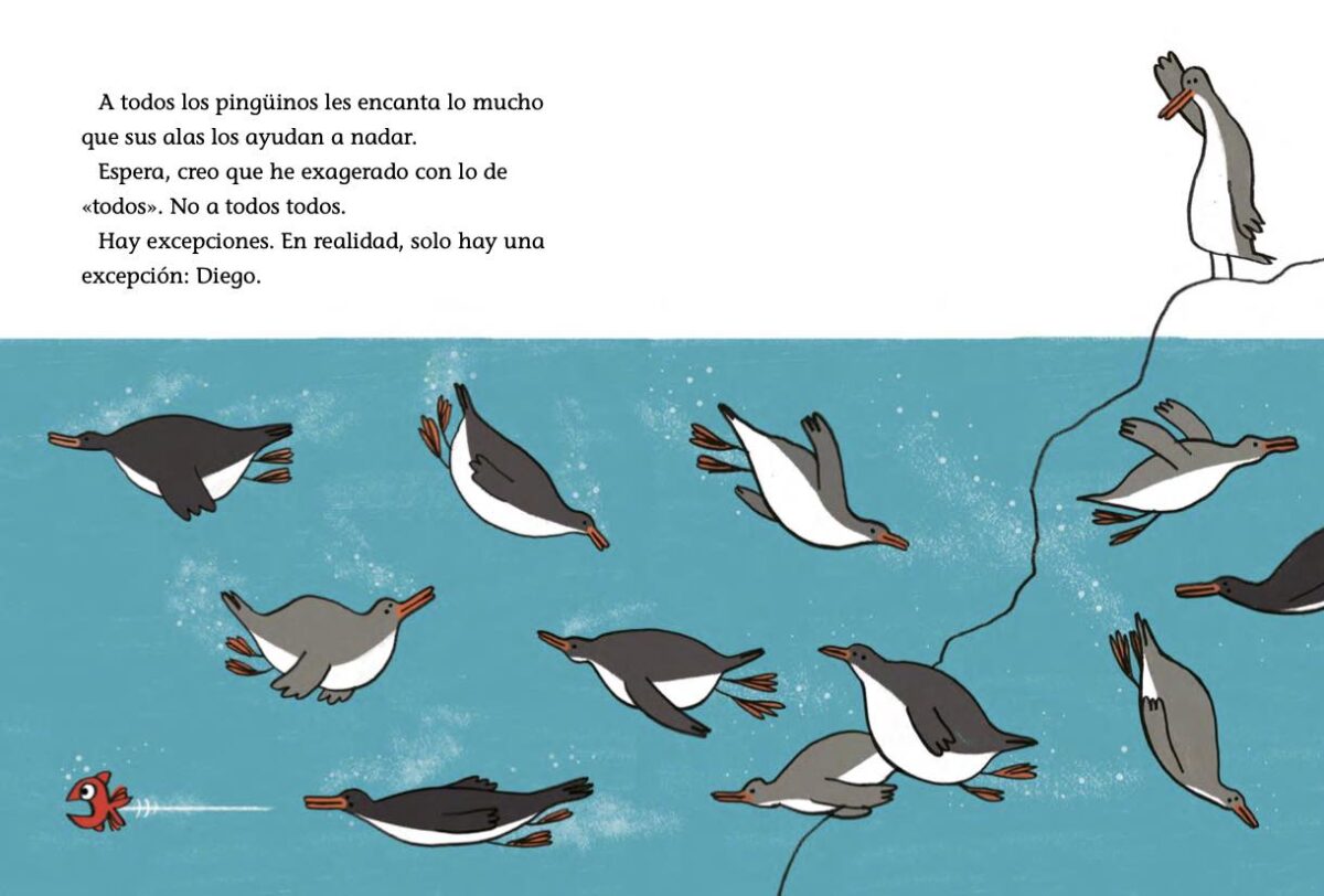 Heute benutzen alle Pinguine ihre Flügel zum Schwimmen. Nun ja, nicht alle. Diego kann nicht besonders gut schwimmen, weil er mit einem Flügel geboren wurde, der immer nach oben zeigt.